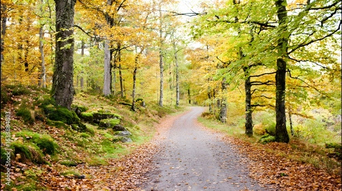 © han, Fototapeta premium Golden autumn path through a serene Swedish forest with scattered leaves.