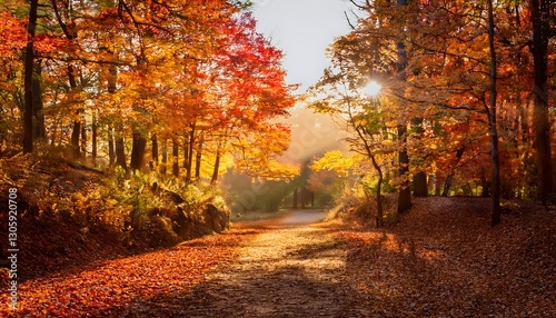 © Desmon, Obraz premium Golden Autumn Pathway Through a Sunlit Forest, Sunlit Forest Pathway Dressed in Fiery Autumn Hues, Tranquil Walkway Amidst Vibrant Autumn Foliage.