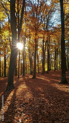 Naklejka premium Golden autumn sunlight filters through trees in a serene forest landscape at...