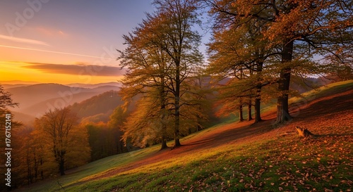 © Edi, Naklejka premium Golden Autumn Sunset Over Rolling Hills and Forest Landscape.