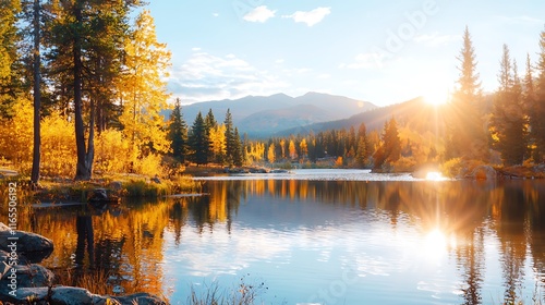 Naklejka premium Golden autumn sunset reflected in a calm lake, surrounded by colorful trees...
