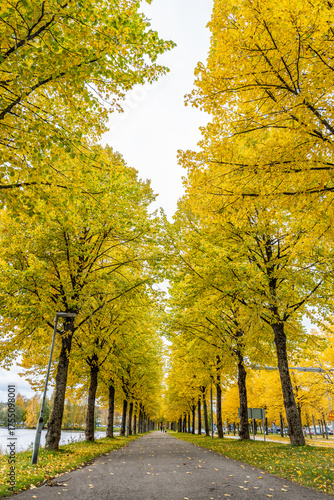 Naklejka premium Golden autumn tree avenue along riverside promenade, Finland