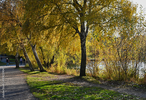 Fototapeta premium Golden Autumn Trees along Green Lake Side Path Seattle Washington