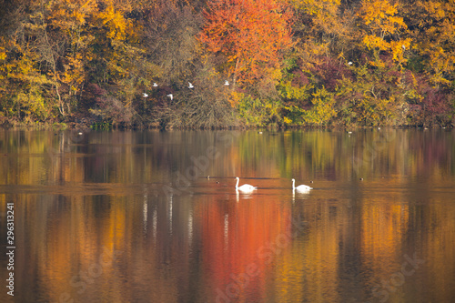 © erika8213, Fototapeta premium Golden autumn trees and lake. Autumn landscape, sunny morning.