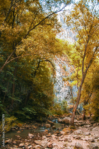 Naklejka premium Golden Autumn Trees Frame a Rocky Stream in a Deep Mountain Canyon