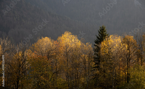 Fototapeta premium Golden autumn trees growing on mountainside with dark forest in background