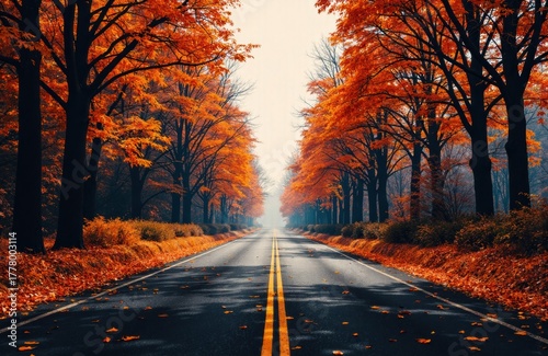Naklejka premium Golden autumn trees line a deserted road with fallen leaves creating a scenic...