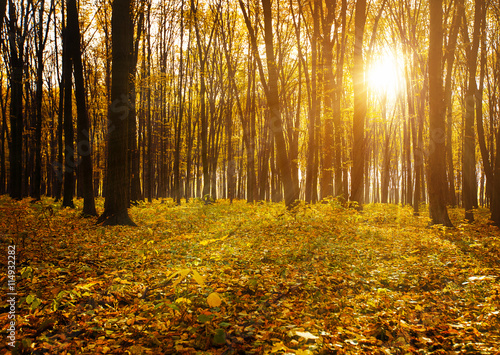 Obraz premium Golden autumnal forest with sunbeams