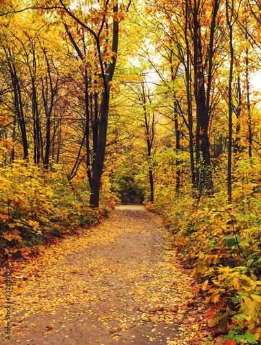 Obraz premium Golden autumnal forest with sunbeams