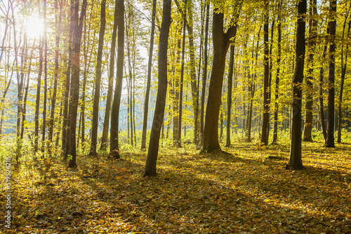© photolink, Obraz premium Golden autumnal forest with sunbeams