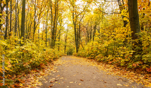 Obraz premium Golden autumnal forest with sunbeams