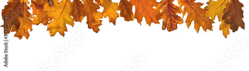 Obraz premium golden autumnal leaf of oak tree in panoramic view on white
