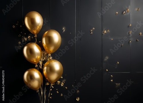 © Nipon, Obraz premium Golden balloons against a black background with scattered gold confetti.
