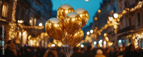 Fototapeta premium Golden 2025 balloons floating among a crowd, New Year's Eve, new year symbol