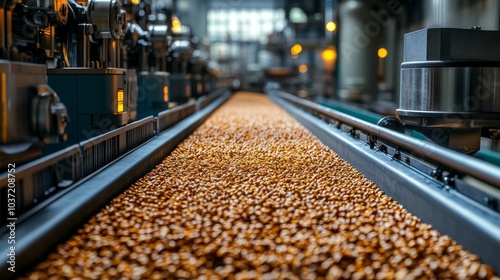 Fototapeta premium Golden barley grains on conveyor.