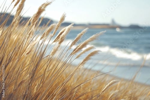 © Kasim, Fototapeta premium Golden beach grass swaying in coastal breeze, ocean waves in background.
