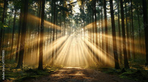 Fototapeta premium Golden beams of sunlight pierce through tall forest trees, creating serene...