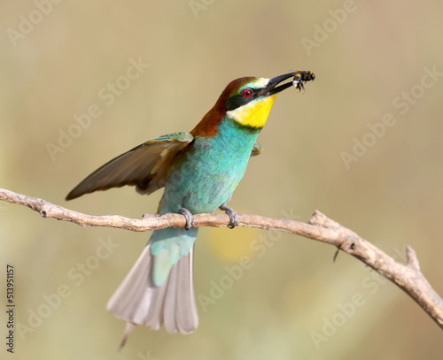 © VOLODYMYR KUCHERENKO, Obraz premium Golden bee-eater filmed with a large bee in its beak on a blurred background