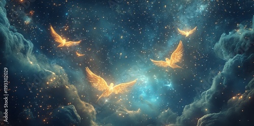 Obraz premium Golden Birds Soaring Through A Celestial Nebula