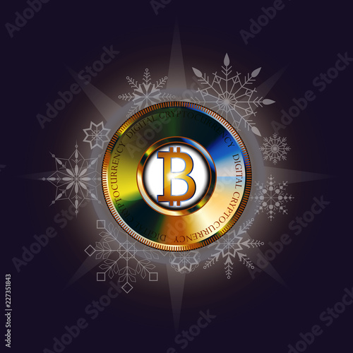© Iulia Ghimisli, Naklejka premium Golden bitcoin banner for Christmas and New Year. Digital Cryptocurrency. Vector. Technology style background