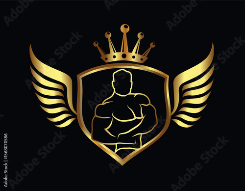 Obraz premium Golden Bodybuilder Shield Logo with Crown and Wings Vector