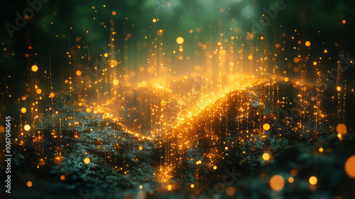 Obraz premium Golden bokeh lights softly illuminating an abstract structure of geometric shapes on a dark green canvas,