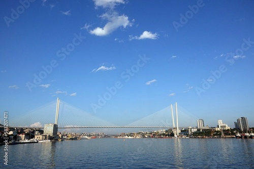 Naklejka premium Golden Bridge - a cable-stayed bridge across the Golden Horn Bay in the city of Vladivostok