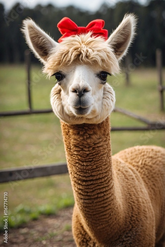 © AC, Obraz premium Golden-Brown Alpaca Wearing a Red Bow in Farm Setting