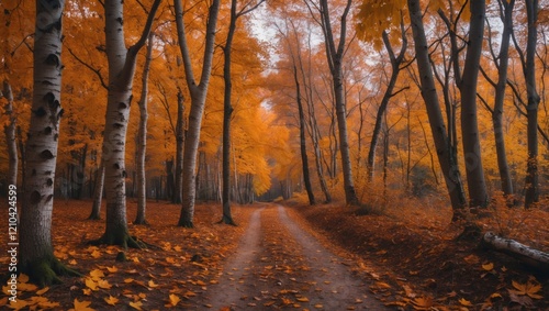 © Artem, Obraz premium Golden brown beech tree along autumn forest path