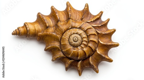 Fototapeta premium Golden Brown Fossilized Spiral Shell On White Background