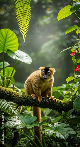 © sadewo, Fototapeta premium Golden Brown Lemur Perched on Mossy Branch in Lush Jungle.