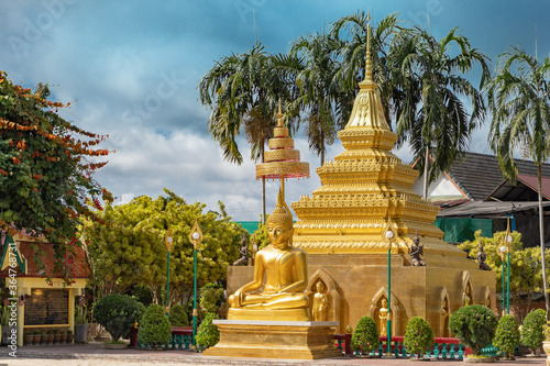 © kae2nata, Fototapeta premium golden buddha image statue with pagoda in south of Thailand