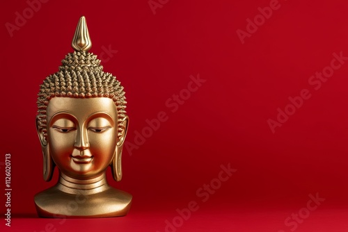 Fototapeta premium Golden buddha statue against red background: peaceful meditation symbol