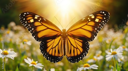 Fototapeta premium Golden Butterfly in Daisy Field Sunlight