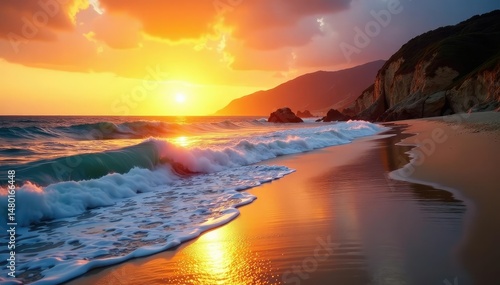 © Chanchai, Fototapeta premium Golden California beach sunset, waves crashing on the shore Tranquil ocean view , peace, vibrant