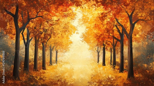 © uswatun, Fototapeta premium Golden Canopy: A Vibrant Autumn Forest Scene in Exquisite Detail and Light