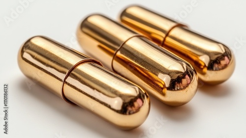 Naklejka premium Golden capsules arranged artistically on a clean white background highlighting elegance and simplicity in pharmaceutical design.