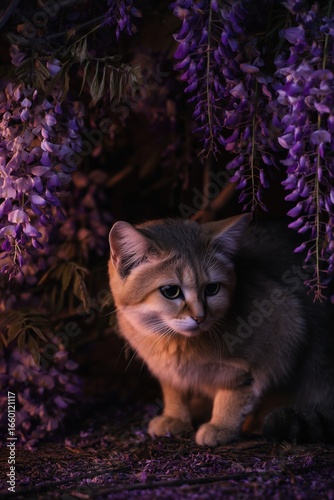 © kiritorisekai_Studio, Obraz premium Golden Cat Under Wisteria Blossoms at Dusk