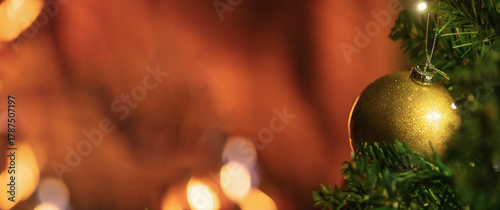 Fototapeta premium Golden Christmas bauble upon green tree branches featuring warm festive...