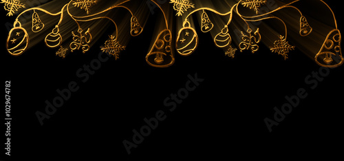 © Rafael, Fototapeta premium Golden christmas decoration is hanging on black background with copy space