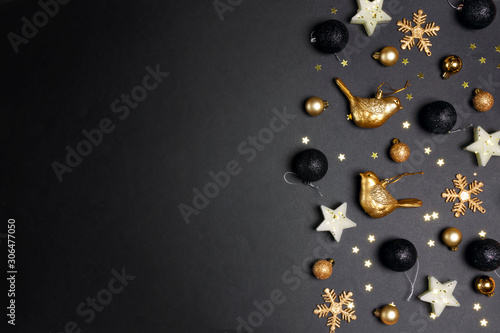 Fototapeta premium Golden Christmas decorations on back background with copy space for text....