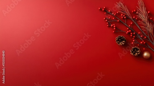 © Tuong, Fototapeta premium Golden Christmas Decorations on Red Background with Copy Space - Pine Cones, Berries, Stars, and Serpentine on Pine Branches