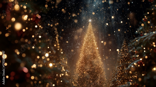 Naklejka premium Golden Christmas Dream: A radiant Christmas tree gleams amidst a magical...