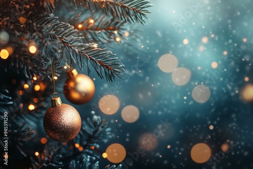 Obraz premium Golden Christmas ornament hanging on a decorated Christmas tree branch with a glowing background.