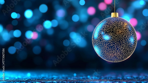 Fototapeta premium Golden Christmas ornament on shimmering blue background with festive bokeh lights, elegant holiday decoration concept, luxury New Year celebration scene.