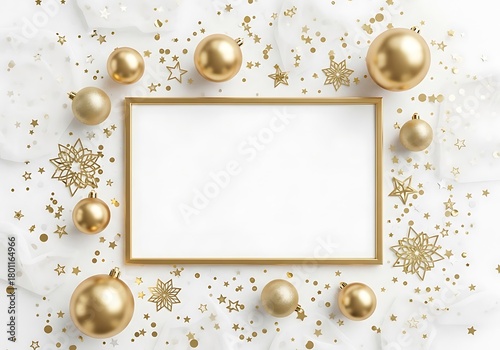 © AH Creation, Fototapeta premium Golden christmas ornaments and confetti frame blank white space