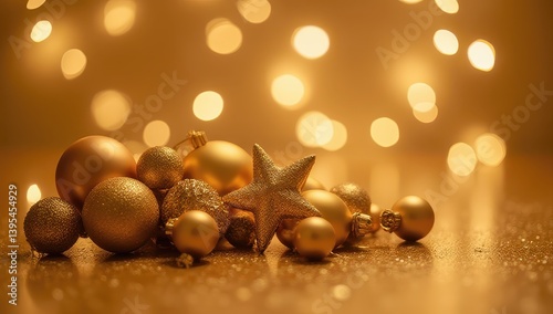 © Dee, Fototapeta premium Golden Christmas Ornaments and Star on Glitter Background