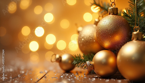 © Andrey, Fototapeta premium Golden Christmas ornaments on wooden table with sparkling bokeh background