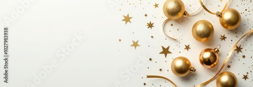 Fototapeta premium Golden Christmas tree balls on a white background. Festive New Year's atmosphere. A Christmas card, a place to copy. Banner