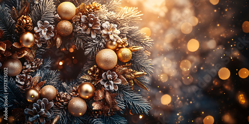 Fototapeta premium Golden Christmas Wreath with Pine Cones and Ornaments